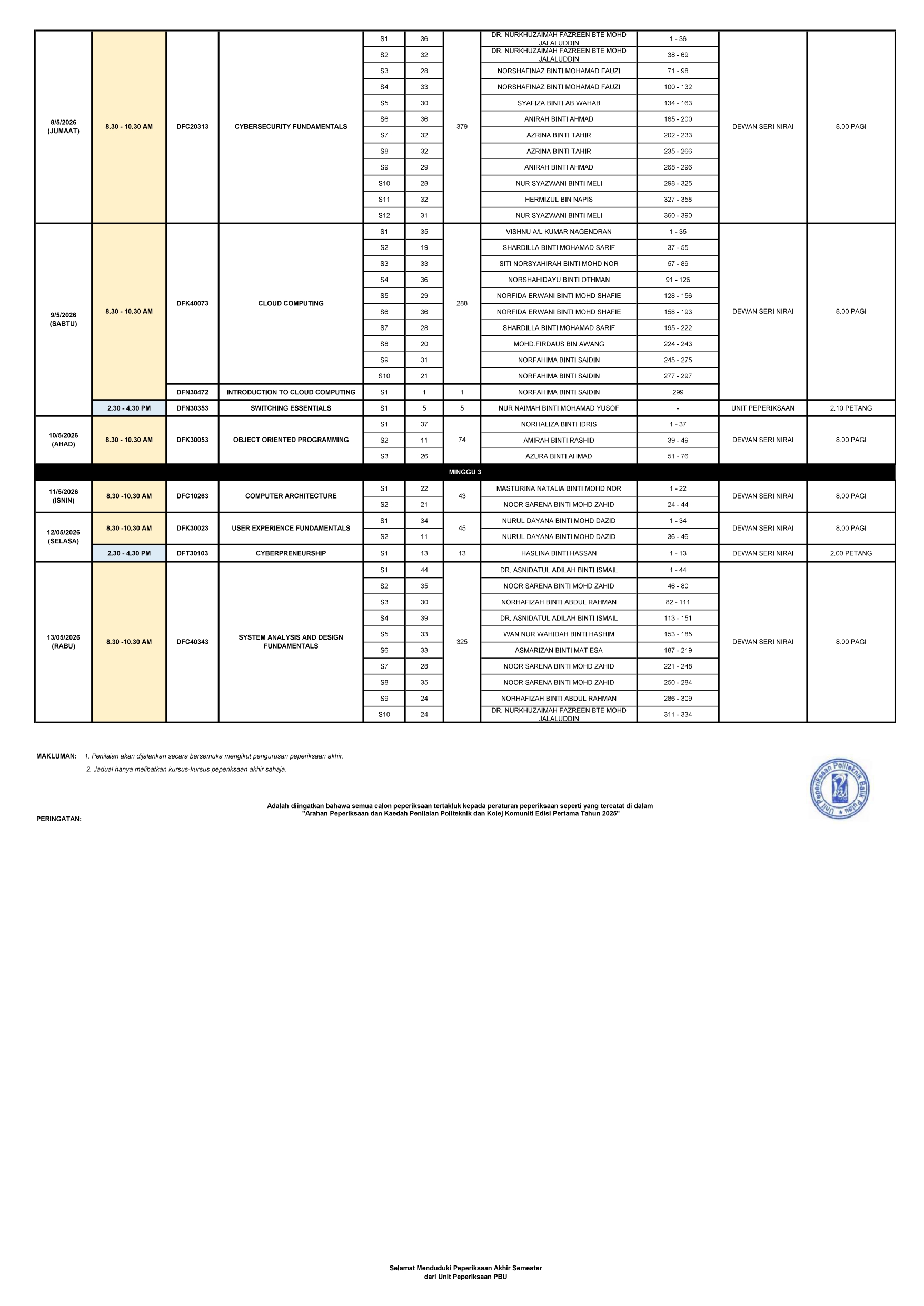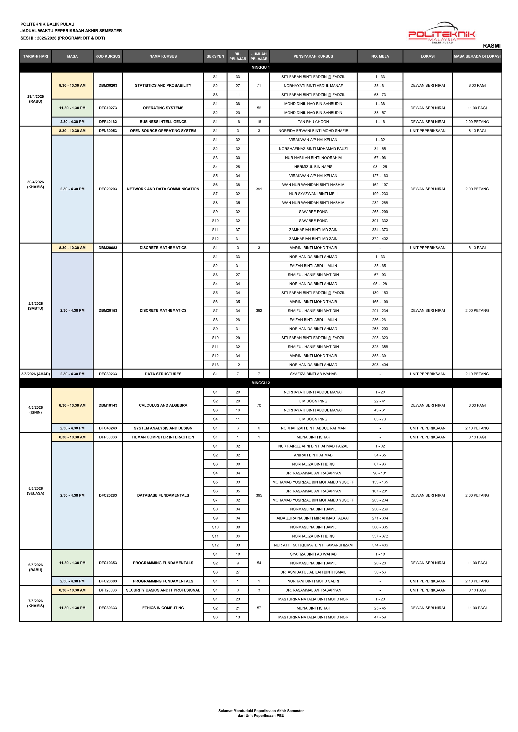 JADUAL WAKTU PEPERIKSAAN AKHIR SEMESTER SESI II : 2025/2026